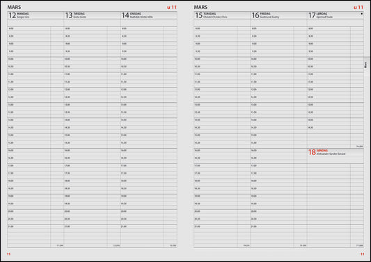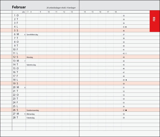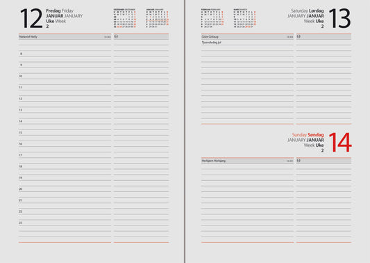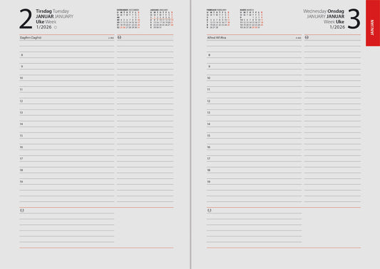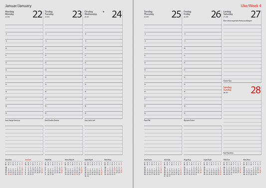 En fin og praktisk kalender som gjør det enkelt å holde styr på dagene. Med god skriveplass og et oversiktlig ukeoppsett får du full kontroll, enten det er jobb eller hverdagsplaner.