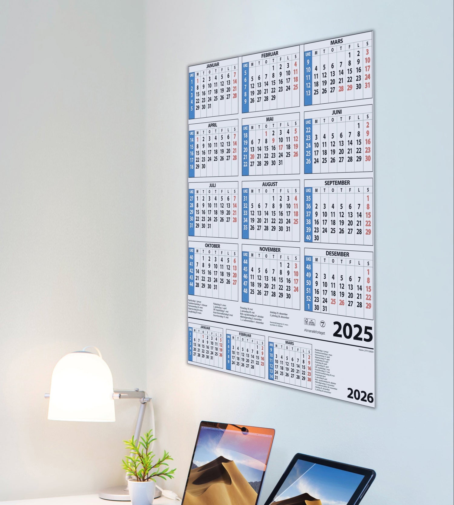 Denne veggkalenderen gir deg en fullstendig oversikt over året på én side. Med sitt enkle design passer den perfekt til både hjem og kontor.