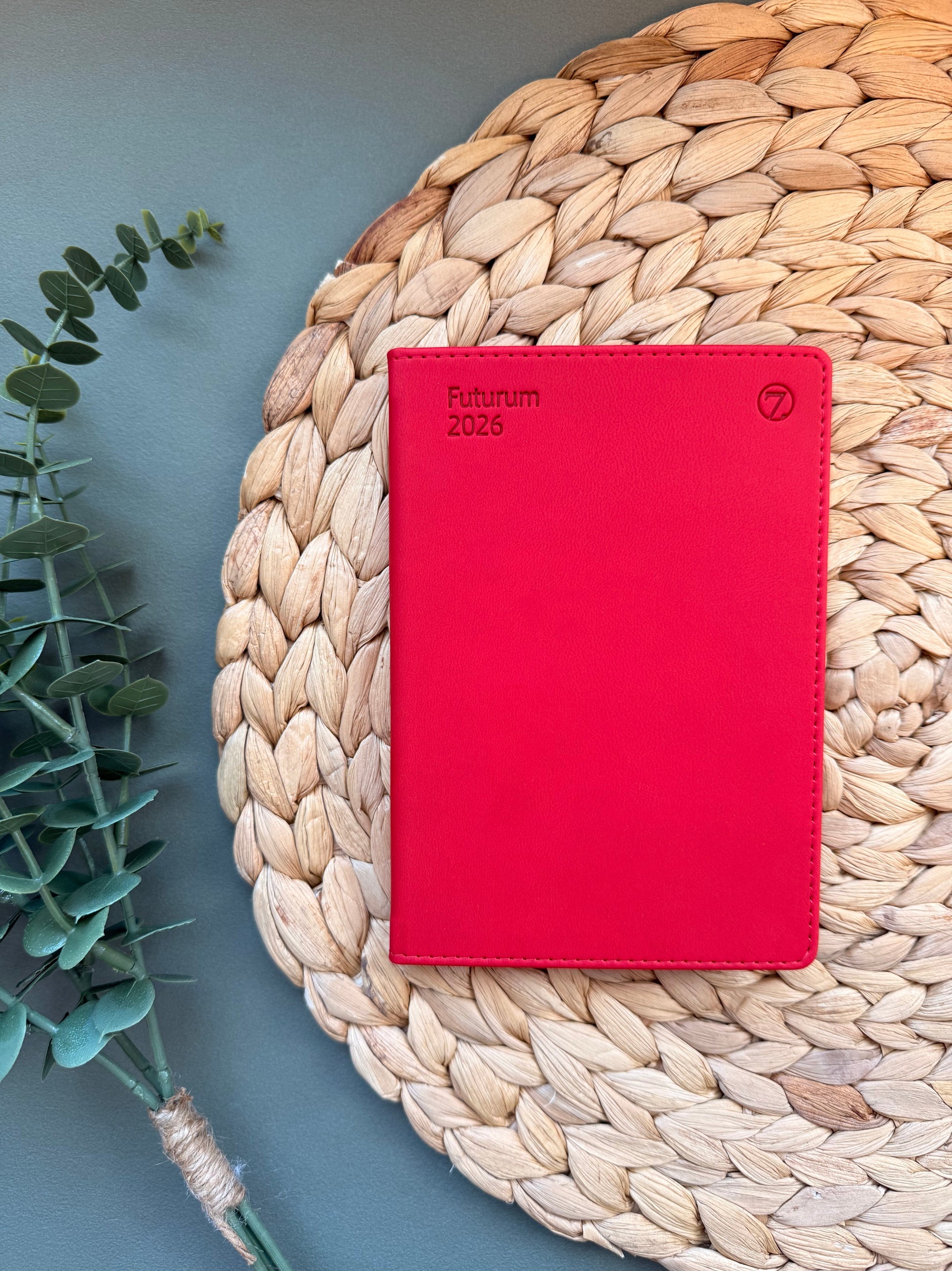 Futurum er en praktisk lommekalender med én uke på to sider og ekstra notatplass for hver uke. Med bredere format enn både Datum og Agenda får du enda mer plass til ukens gjøremål – perfekt for deg som vil ha oversikt og god skriveflate i en kompakt kalender. Leveres som innbundet utgave i imitert skinn med elegant rød farge. Kalenderen inneholder også informasjonsstoff, notatsider og kart.
