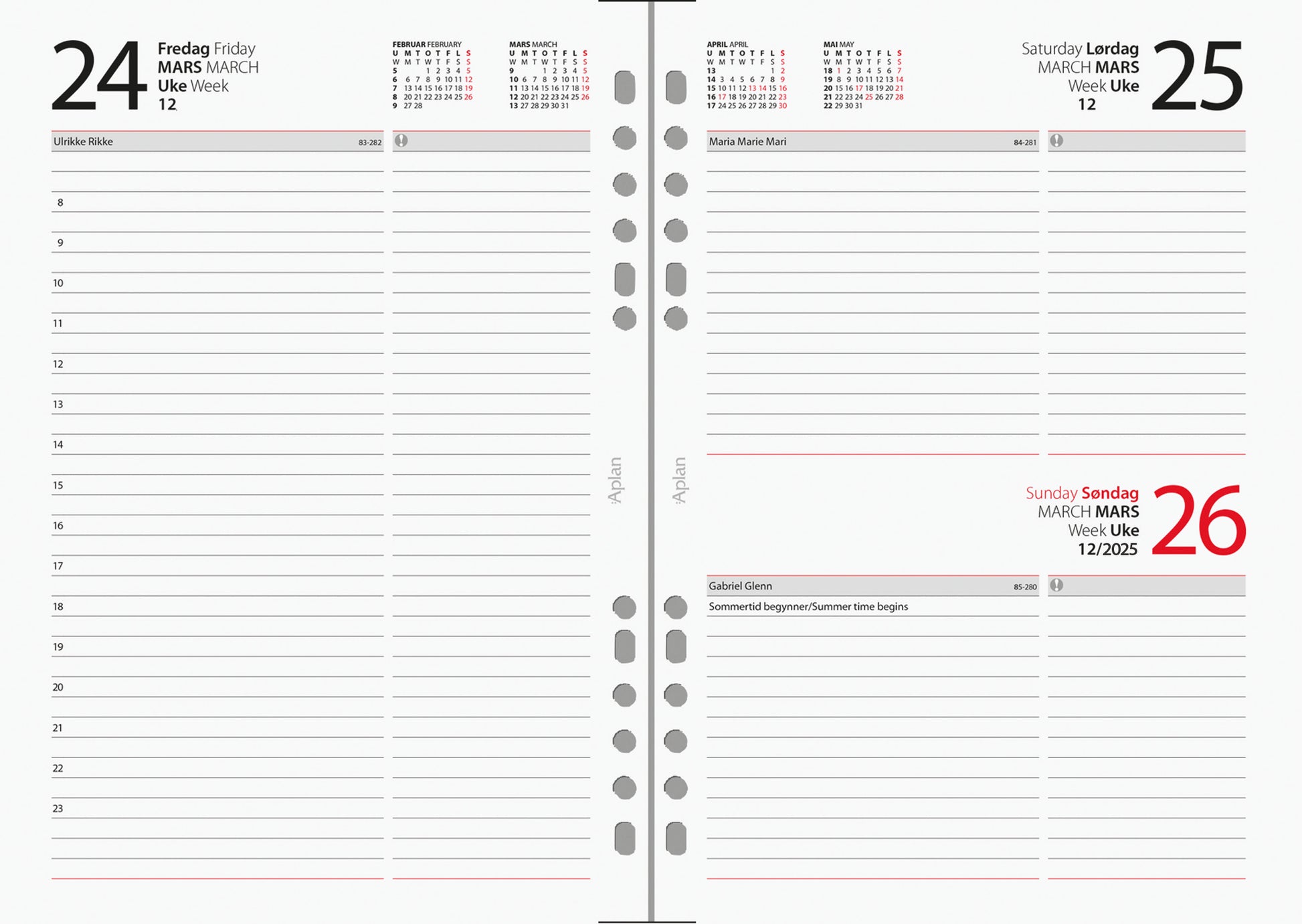 Aplan A5 Dag årssett gir deg full kontroll over dagen, med én side per dag og klokkeslett fra 08:00–23:00. Dette gjør den ideell for deg som har mange avtaler, møter eller oppgaver i løpet av dagen og ønsker en detaljert oversikt. Årssettet passer perfekt i våre Aplan A5-permer, slik at du kan gjenbruke omslaget år etter år.