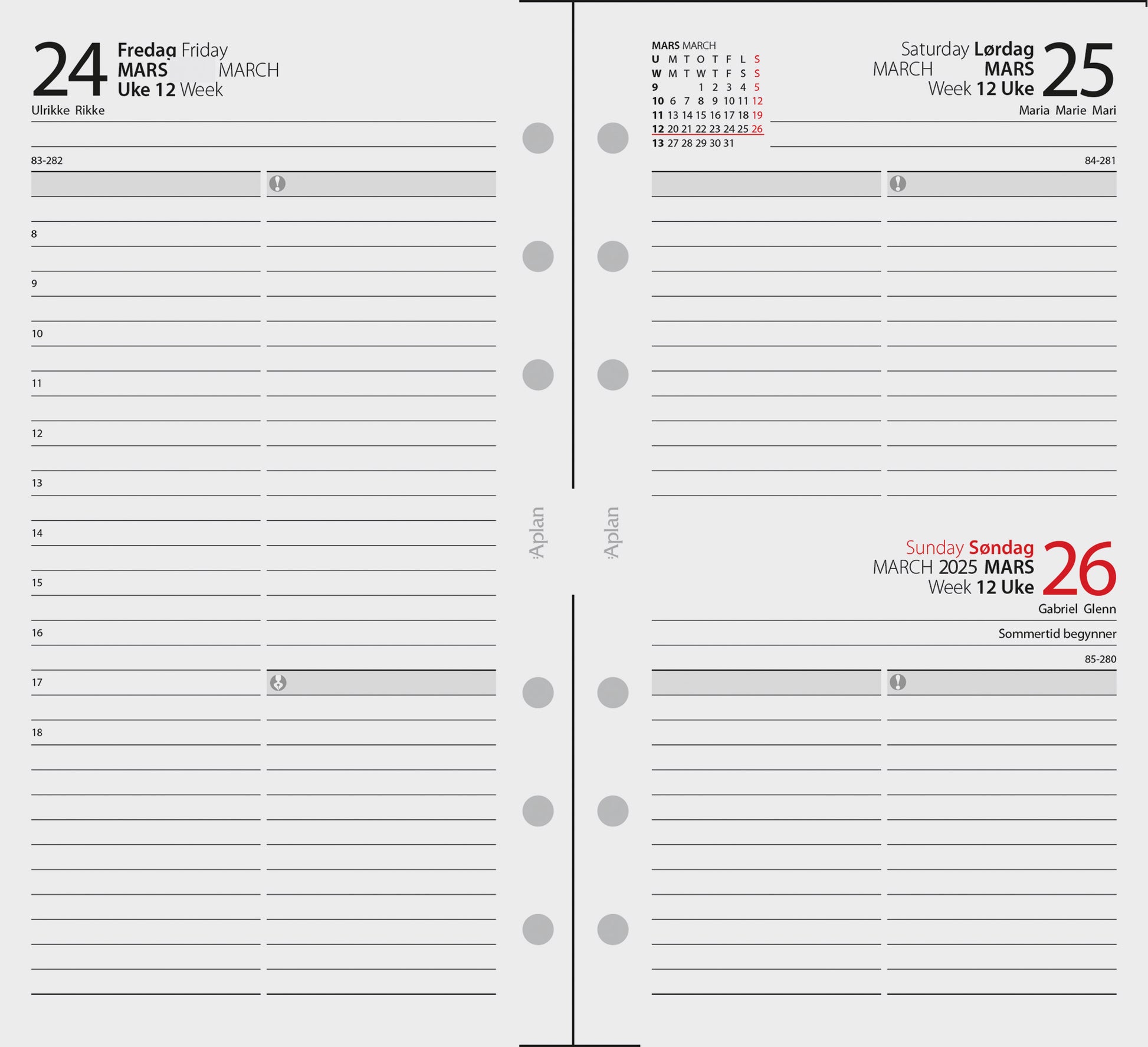 Aplan A6 Tempus dag årssett gir deg én hel side per dag med timeinndeling fra 08:00–18:00 – perfekt for deg med mange avtaler, oppgaver og notater i løpet av dagen. Årssettet er laget for bruk i våre Aplan A6-permer, slik at du kan beholde omslaget og kun bytte innhold hvert år.