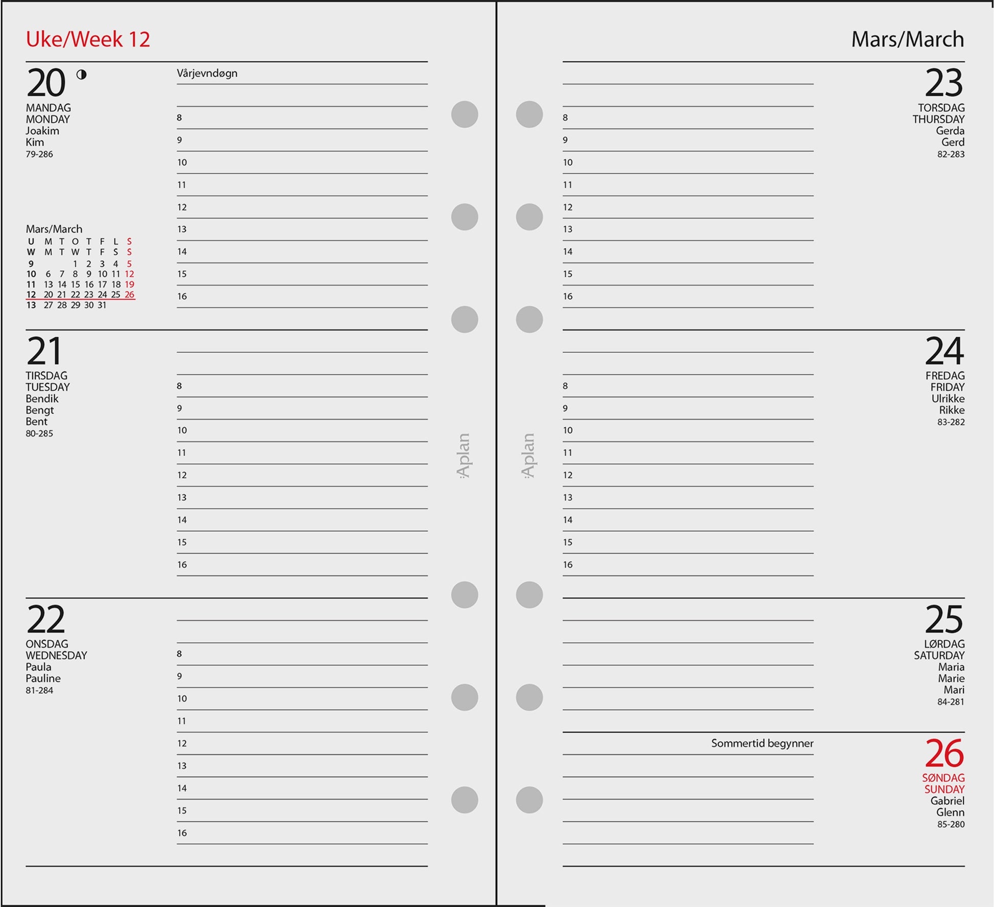 Aplan A6 Time uke årssett gir deg en praktisk og oversiktlig ukeplan med timeinndeling fra 08:00–16:00. Årssettet passer perfekt i våre Aplan A6-permer, og gir deg fleksibiliteten til å fornye innholdet hvert år. Med dette systemet har du alltid en ryddig og oppdatert kalender – uten å bytte hele planleggeren.
