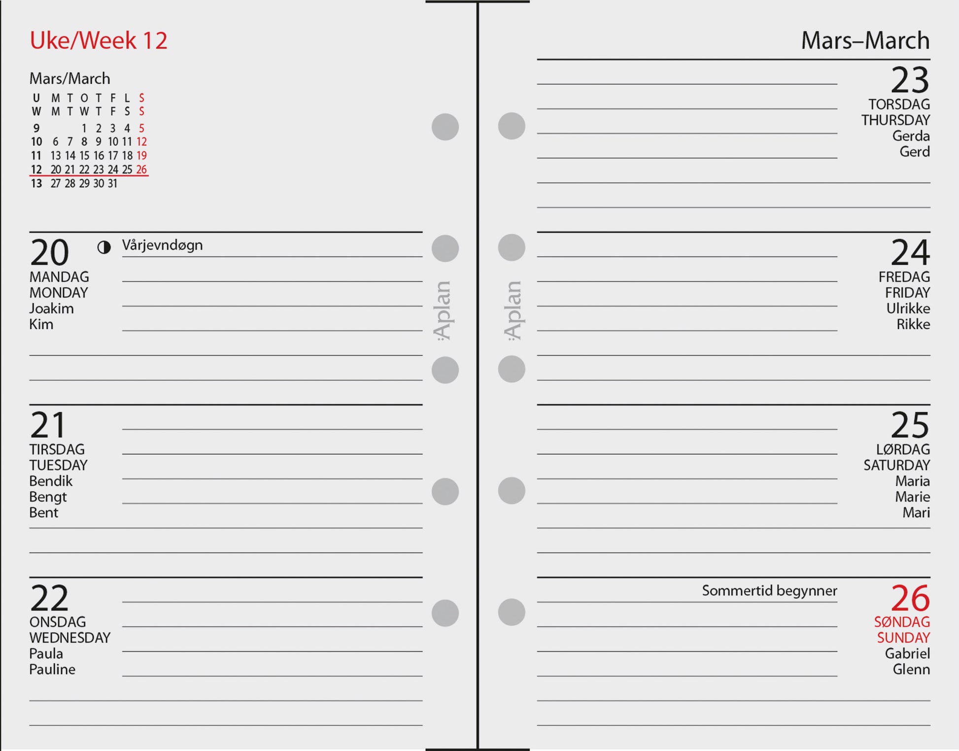 Aplan Mini Uke årssett er en praktisk og fleksibel kalenderpakke med én uke på to sider, perfekt til deg som bruker Aplan-systemet. Formatet passer i Aplan Mini-permene, og gjør det enkelt å fornye innholdet år etter år. Kalenderen gir deg oversikt over hele uken, med god plass til avtaler og notater – og i tillegg års- og månedsoversikter.