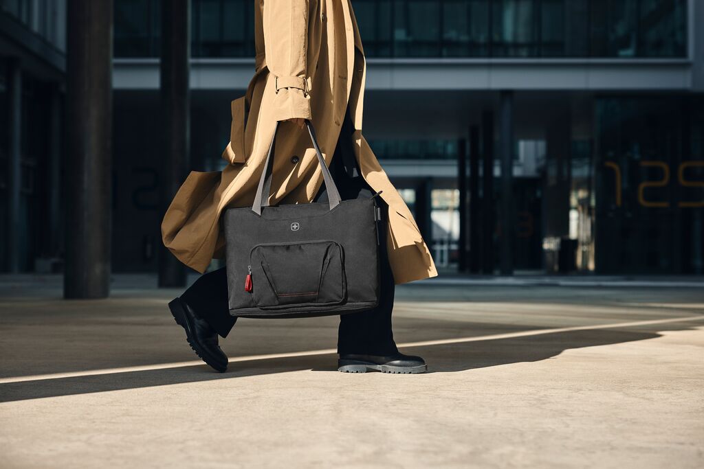 Wenger Motion Deluxe Tote, 15.6" Laptop-veske med nettbrettlomme, Chic Black Motion Deluxe Tote løfter hverdagsvesken til et nytt nivå. Denne multifunksjonelle vesken er skapt for deg som balanserer jobb og fritid, og har plass til alt fra laptop og nettbrett til yogamatte eller jakke.